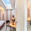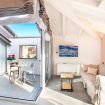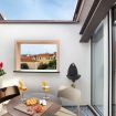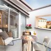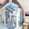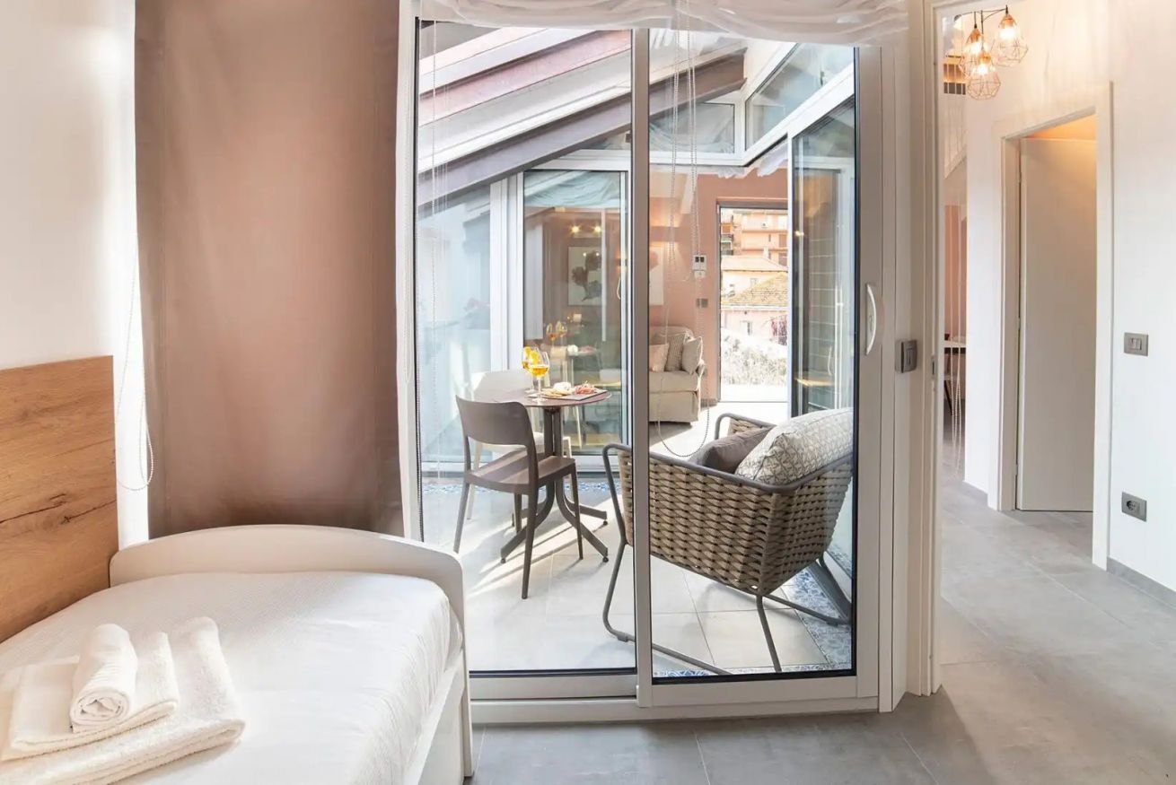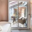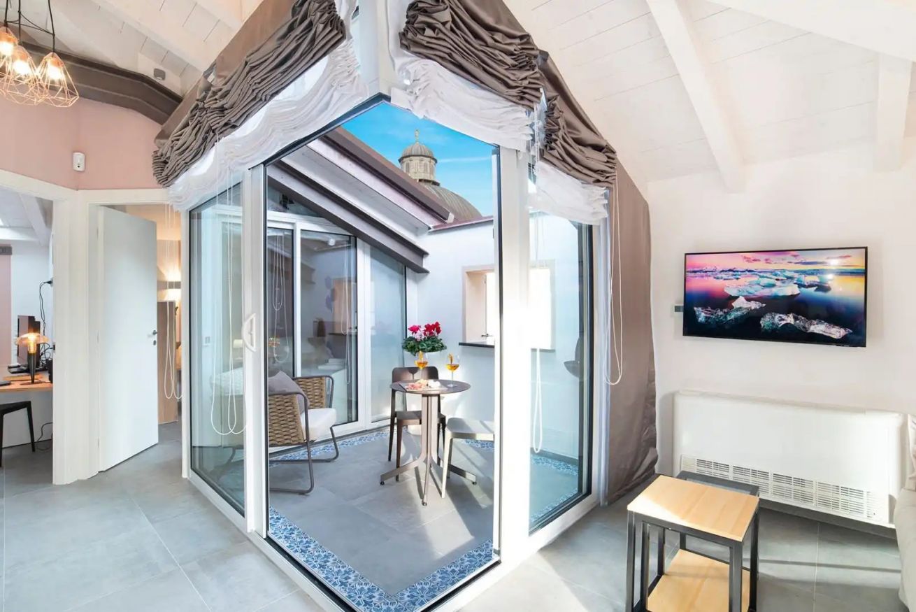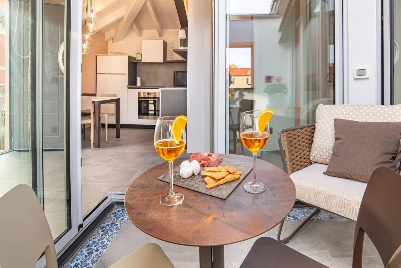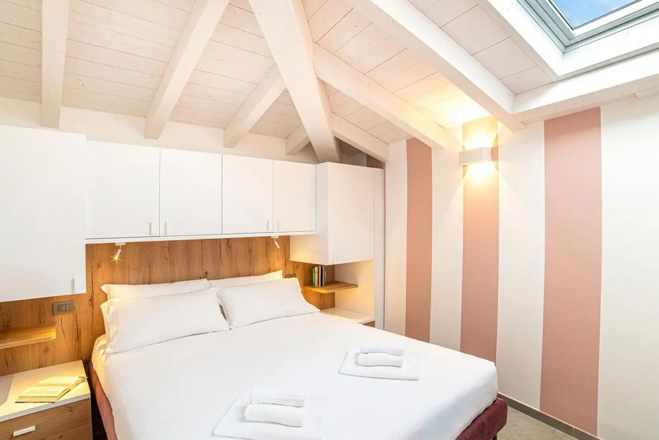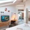L'alloggio mansardato, molto spazioso e pratico, è arredato in modo moderno ed ergonomico. La zona giorno è molto accogliente e luminosa, con una grande vetrata che affaccia sulla caratteristica e suggestiva terrazzina a pozzetto, luogo ideale per una buona lettura in totale privacy, o per un'aperitivo in assoluto relax. La terrazza è protetta da una tenda elettrica nel caso di una giornata molto assolata.
